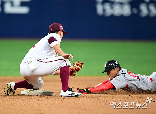 [엑스포츠뉴스 김한준 기자] 7일 오후 서울 구로구 고척스카이돔에서 열린 '2016 타이어뱅크 KBO리그' SK 와이번스와 넥센 히어로즈의 경기, 5회초 1사 1루 SK 이명기가 2루 도루를 시도했지만 넥센 서건창에게 태그아웃을 당하고 있다.