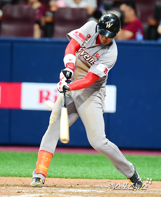 [엑스포츠뉴스 김한준 기자] 7일 오후 서울 구로구 고척스카이돔에서 열린 '2016 타이어뱅크 KBO리그' SK 와이번스와 넥센 히어로즈의 경기, 7회초 무사 1루 SK 이명기가 좌중간 2루타를 날리고 있다.