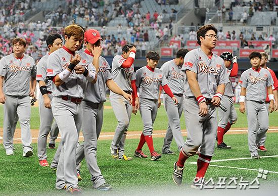 이날 경기에서 패한 SK 선수들이 관중석에 인사를 한 후 그라운드를 빠져나가고 있다.