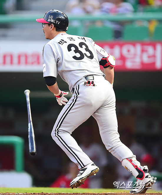 [엑스포츠뉴스 인천, 김한준 기자] 9일 오후 인천SK행복드림구장에서 열린 '2016 타이어뱅크 KBO리그' LG 트윈스와 SK 와이번스의 경기, 3회초 2사 LG 박용택이 솔로 홈런을 날리고 있다.