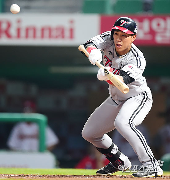 [엑스포츠뉴스 인천, 김한준 기자] 9일 오후 인천SK행복드림구장에서 열린 '2016 타이어뱅크 KBO리그' LG 트윈스와 SK 와이번스의 경기, 5회초 무사 1,2루 LG 이천웅이 보내기 번트를 시도하고 있다.