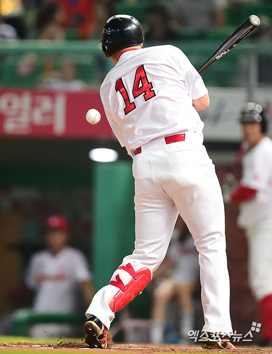 [엑스포츠뉴스 인천, 김한준 기자] 9일 오후 인천SK행복드림구장에서 열린 '2016 타이어뱅크 KBO리그' LG 트윈스와 SK 와이번스의 경기, 7회말 1사 1루 SK 최정이 사구에 맞고 있다.