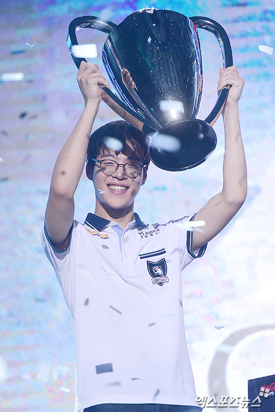 경기 종료 후 락스 타이거즈 '스멥' 송경호가 우승 트로피를 들어올리고 있다.