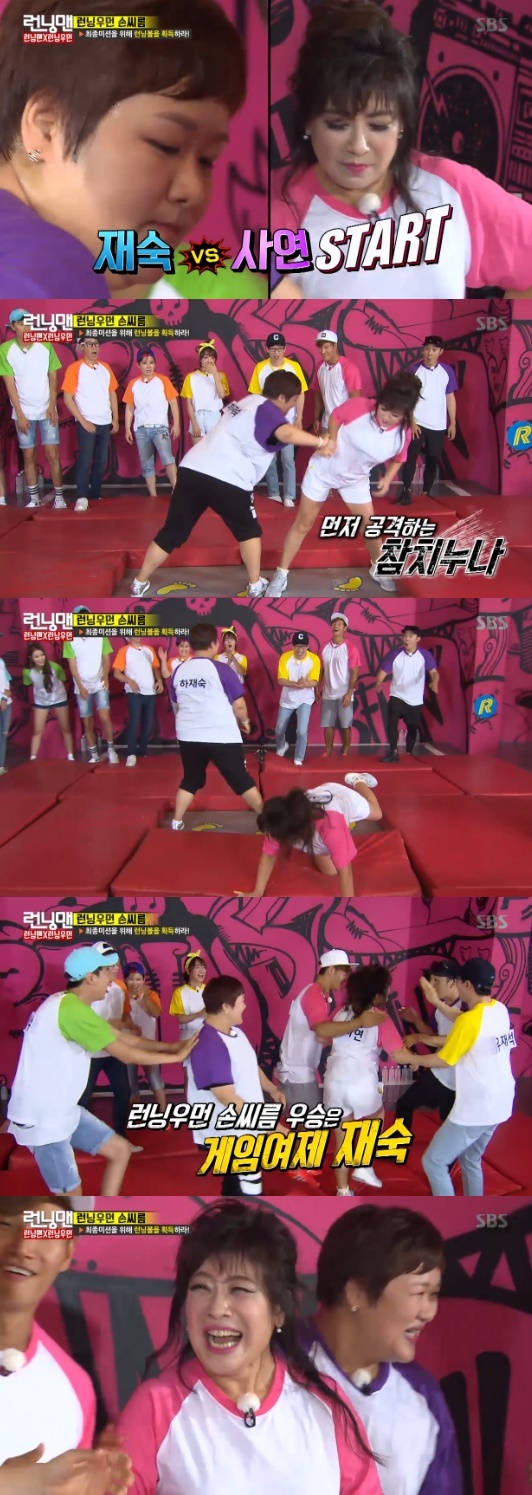 이후 런닝우먼 손씨름이 펼쳐졌다. 하재숙과 노사연의 결승전. 하재숙은 방어하는 척 하면서 노사연의 손을 놓았고, 단숨에 게임여제로 등극했다. 유재석은 "누나가 당황하는 거 처음 봤어"라며 "누나가 일어나면서 '쟤는 안 되겠다'라고 했다"라고 밝혀 웃음을 자아냈다.