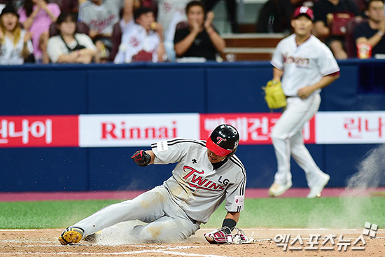 [엑스포츠뉴스 박지영 기자] 25일 오후 서울 구로구 고척스카이돔에서 열린 '2016 타이어뱅크 KBO리그' LG 트윈스와 넥센 히어로즈의 경기, 3회초 1사 1,2루 LG 채은성이 정성훈의 적시타에 홈으로 쇄도하며 득점에 성공하고 있다.