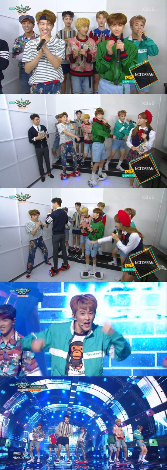 이날 '츄잉검'으로 활동 중인 그룹 NCT 드림은 화제가 되고 있는 호버보드를 타고 안무를 하는 모습을 직접 보여줬다. 민혁과 솔빈에게 호버보드를 타는 방법을 알려 주기도.