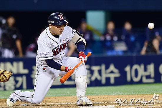 [엑스포츠뉴스 박지영 기자] 2일 오후 서울 송파구 잠실야구장에서 열린 '2016 타이어뱅크 KBO리그' kt wiz와 두산 베어스의 경기, 7회말 무사 1루 두산 양의지가 번트를 시도하고 있다.