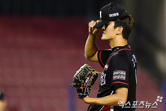 [엑스포츠뉴스 박지영 기자] 2일 오후 서울 송파구 잠실야구장에서 열린 '2016 타이어뱅크 KBO리그' kt wiz와 두산 베어스의 경기, 7회말 2사 만루 kt 고영표가 두산 최주환에게 몸에 맞는 볼로 실점을 허용한 뒤 아쉬워하고 있다.