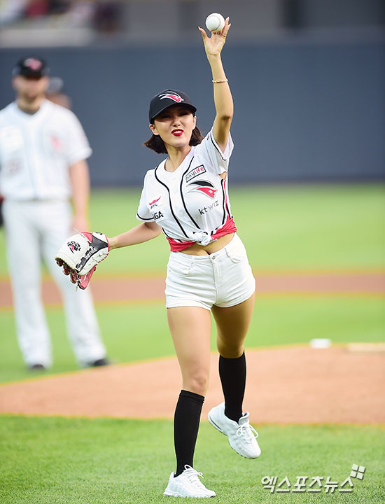 [엑스포츠뉴스 수원, 김한준 기자] 10일 오후 경기도 수원시 장안구 수원kt위즈파크에서 열린 '2016 타이어뱅크 KBO리그' KIA 타이거즈와 kt 위즈의 경기, 경기 전 걸그룹 마마무 화사가 시구에 임하고 있다.