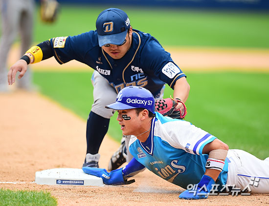 [엑스포츠뉴스 대구, 김한준 기자] 11일 오후 대구삼성라이온즈파크에서 열린 '2016 타이어뱅크 KBO리그' NC 다이노스와 삼성 라이온즈의 경기, 6회말 1사 3루 삼성 박해민이 NC 김태군의 3루 견제에 귀루하고 있다.