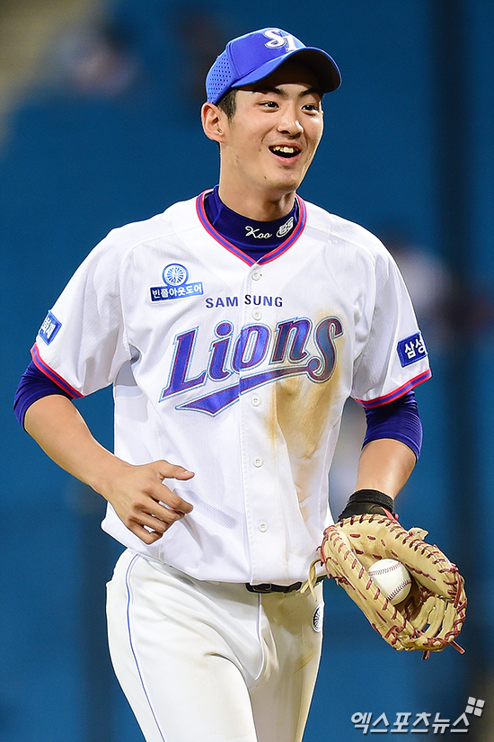 [엑스포츠뉴스 대구, 박지영 기자] 13일 오후 대구삼성라이온즈파크에서 열린 '2016 타이어뱅크 KBO리그' 한화 이글스와 삼성 라이온즈의 경기, 4회초 삼성 구자욱이 이닝 종료 후 더그아웃으로 향하며 미소짓고 있다.