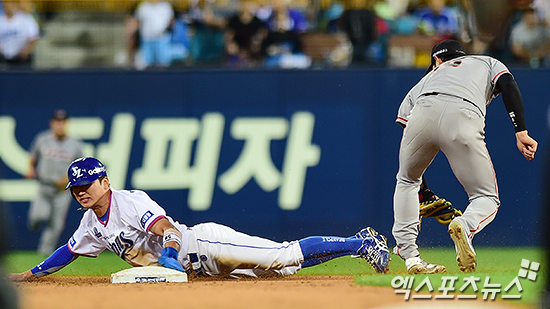 [엑스포츠뉴스 대구, 박지영 기자] 13일 오후 대구삼성라이온즈파크에서 열린 '2016 타이어뱅크 KBO리그' 한화 이글스와 삼성 라이온즈의 경기, 5회말 무사 1,3루 삼성 박해민이 2루로 도루 성공하고 있다.
