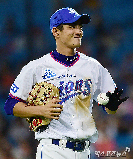 [엑스포츠뉴스 대구, 박지영 기자] 13일 오후 대구삼성라이온즈파크에서 열린 '2016 타이어뱅크 KBO리그' 한화 이글스와 삼성 라이온즈의 경기, 7회초 삼성 구자욱이 이닝 종료 후 팀 25,000번째 탈삼진 공을 들고 미소짓고 있다.