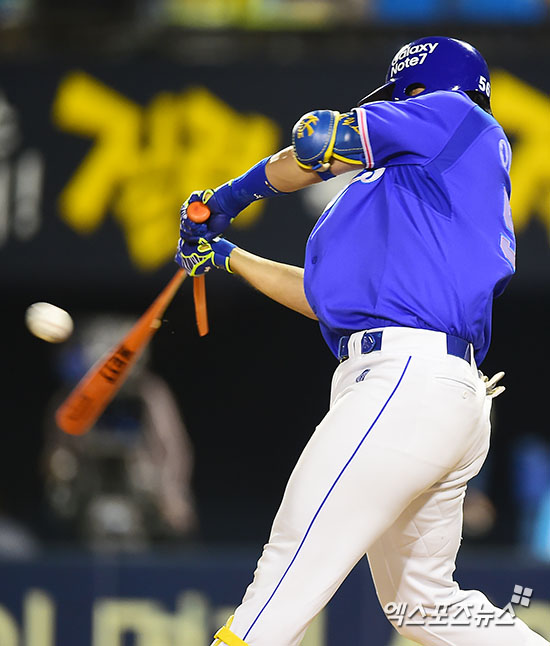 [엑스포츠뉴스 김한준 기자] 20일 오후 서울 송파구 잠실야구장에서 열린 '2016 타이어뱅크 KBO리그' 삼성 라이온즈와 두산 베어스의 경기, 4회초 2사 1,2루 삼성 이지영이 1타점 적시타를 날리고 있다.