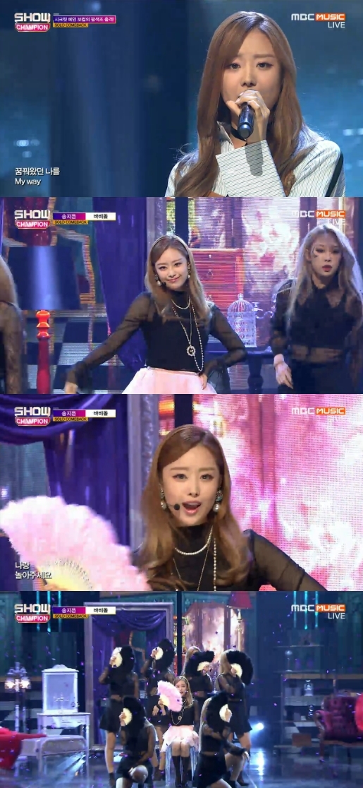 송지은은 21일 방송된 MBC뮤직 '쇼챔피언'에서 타이틀곡 '바비돌'과 수록곡 '오아시스' 무대를 꾸몄다.