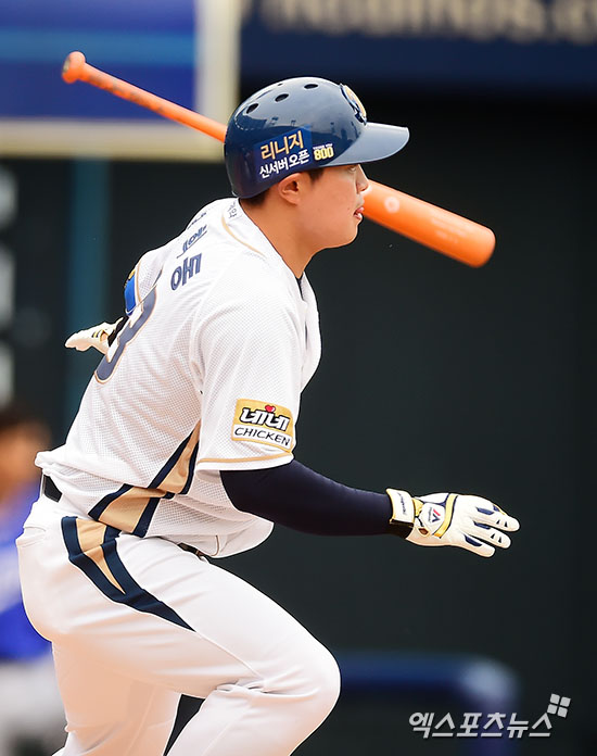 [엑스포츠뉴스 창원, 김한준 기자] 29일 오후 경남 창원 마산야구장에서 열린 '2016 타이어뱅크 KBO리그' 삼성 라이온즈와 NC 다이노스의 더블헤더 1경기, 1회말 2사 1루 NC 권희동이 좌전안타를 날리고 있다.