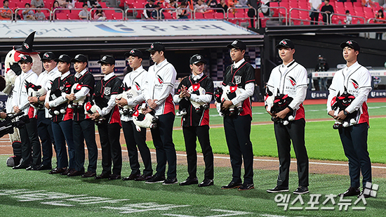 [엑스포츠뉴스 수원, 박지영 기자] 5일 오후 수원시 장안구 수원kt위즈파크에서 열린 '2016 타이어뱅크 KBO리그' 한화 이글스와 kt 위즈의 경기에 앞서 2017 kt 신인 지명 선수들이 그라운드에서 인사하고 있다.