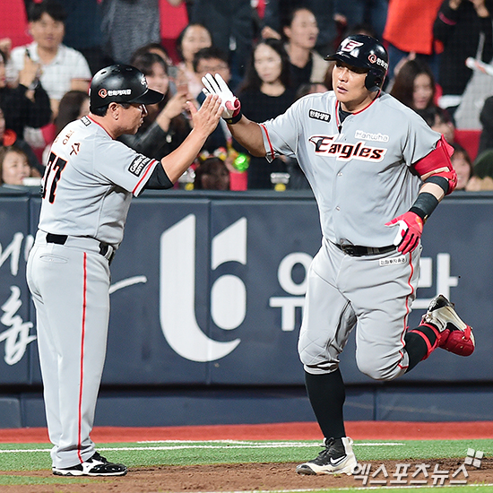 [엑스포츠뉴스 수원, 박지영 기자] 5일 오후 수원시 장안구 수원kt위즈파크에서 열린 '2016 타이어뱅크 KBO리그' 한화 이글스와 kt 위즈의 경기, 7회초 무사 한화 김태균이 솔로 홈런을 터뜨리며 역대 최연소 3,000루타를 달성하고 있다.