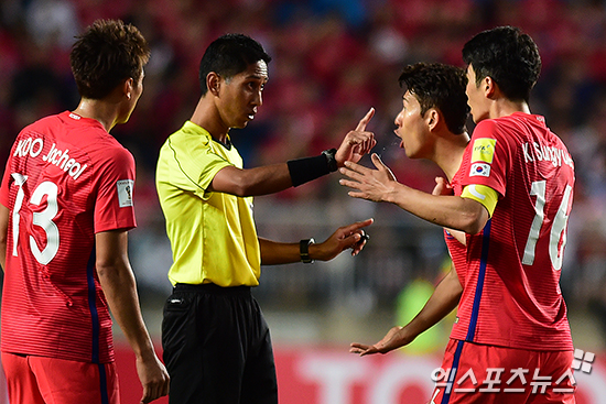 [엑스포츠뉴스 수원, 박지영 기자] 6일 오후 수원시 팔달구 수원월드컵경기장에서 열린 '2018 러시아 월드컵 최종예선 3차전' 대한민국과 카타르의 경기, 전반 한국 기성용과 손흥민이 주심에게 항의하고 있다.