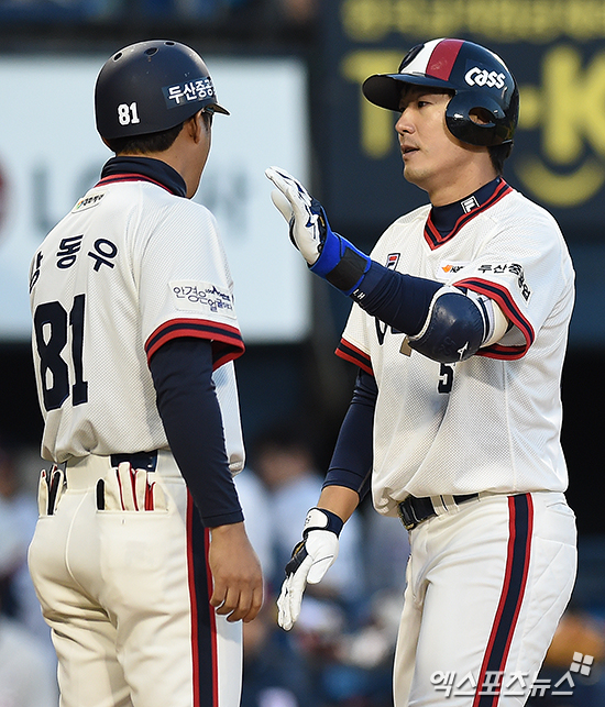 [엑스포츠뉴스 박지영 기자] 8일 오후 서울 송파구 잠실야구장에서 열린 '2016 타이어뱅크 KBO리그' 두산 베어스와 LG 트윈스의 경기, 4회초 무사 두산 김재호가 좌월 솔로 홈런을 때려낸 뒤 홈에서 하이파이브를 하고 있다.