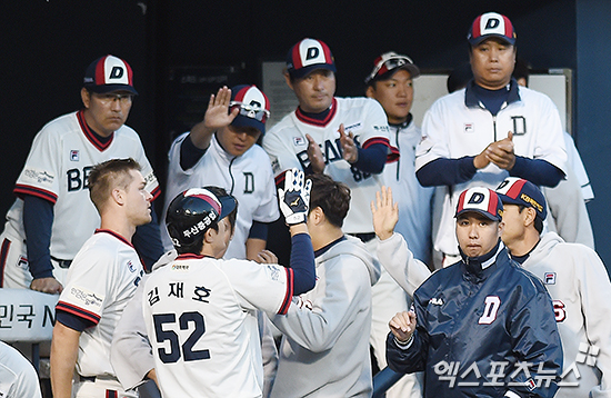 [엑스포츠뉴스 박지영 기자] 8일 오후 서울 송파구 잠실야구장에서 열린 '2016 타이어뱅크 KBO리그' 두산 베어스와 LG 트윈스의 경기, 4회초 무사 두산 김재호가 좌월 솔로 홈런을 때려낸 뒤 더그아웃에서 동료들과 하이파이브를 하고 있다.
