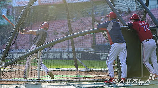 [엑스포츠뉴스 박지영 기자] 10일 오후 서울 송파구 잠실야구장에서 열린 '2016 타이어뱅크 KBO리그 포스트시즌' KIA 타이거즈와 LG 트윈스의 와일드카드 결정전 1차전 경기에 앞서 KIA 김기태 감독이 선수들의 타격 연습을 바라보고 있다.