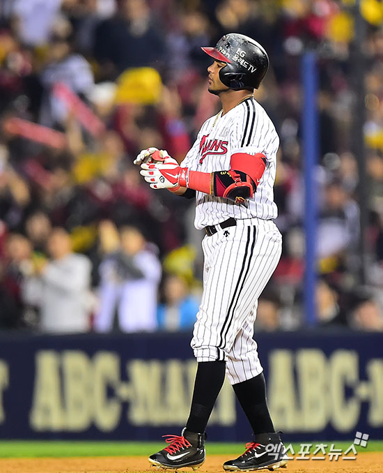 [엑스포츠뉴스 김한준 기자] 11일 오후 서울 송파구 잠실야구장에서 열린 '2016 타이어뱅크 KBO리그 포스트시즌' KIA 타이거즈와 LG 트윈스의 와일드카드 결정전 2차전 경기, 4회말 LG 히메네스가 중전안타를 날린 후 박수를 치고 있다.