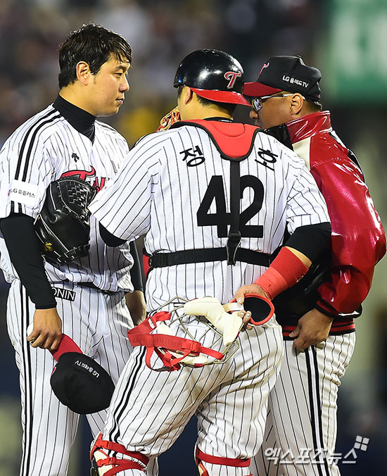 [엑스포츠뉴스 김한준 기자] 11일 오후 서울 송파구 잠실야구장에서 열린 '2016 타이어뱅크 KBO리그 포스트시즌' KIA 타이거즈와 LG 트윈스의 와일드카드 결정전 2차전 경기, 6회초 2사 2루 LG 선발투수 류제국이 KIA 이범호에게 사구를 허용하자 강상수 코치가 마운드에 올라와 대화를 나누고 있다.