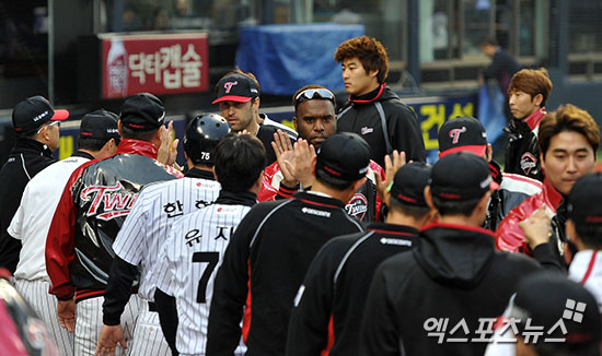 이날 경기에서 승리한 LG 선수들이 하이파이브를 하고 있다.