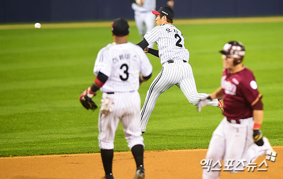 [엑스포츠뉴스 김한준 기자] 17일 오후 서울 송파구 잠실야구장에서 열린 '2016 타이어뱅크 KBO리그 포스트시즌' 넥센 히어로즈와 LG 트윈스의 준플레이오프 4차전 경기, 2회초 1사 1,2루 넥센 박동원의 타구가 LG 오지환의 글러브 맞고 굴절되고 있다.
