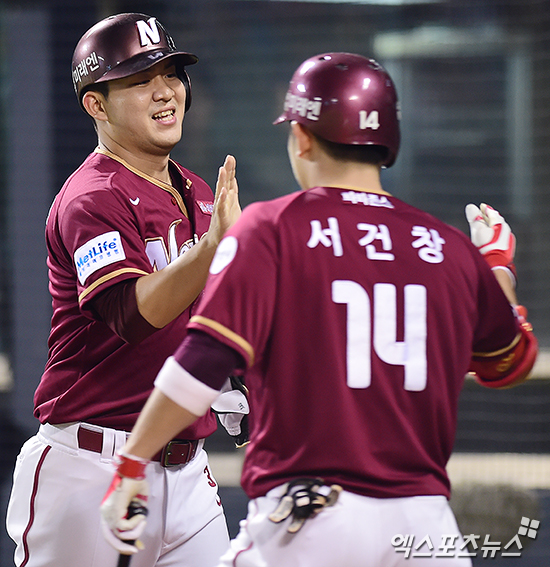 [엑스포츠뉴스 박지영 기자] 17일 오후 서울 송파구 잠실야구장에서 열린 '2016 타이어뱅크 KBO리그 포스트시즌' 넥센 히어로즈와 LG 트윈스의 준플레이오프 4차전 경기, 2회초 1사 1,2루 넥센 김민성이 박동원의 1타점 2루타에 득점한 뒤 서건창과 하이파이브 하고 있다.
