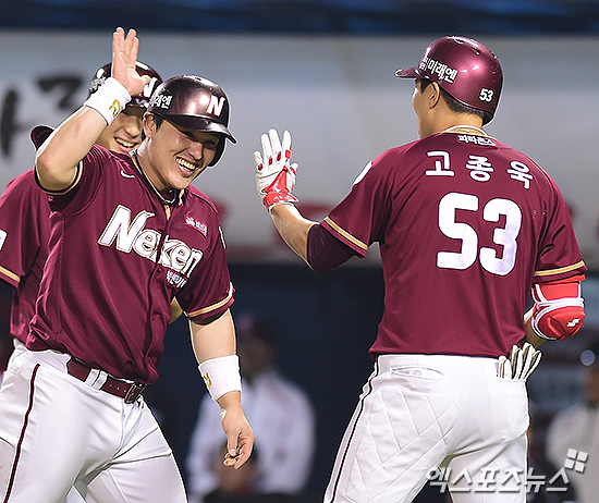 [엑스포츠뉴스 박지영 기자] 17일 오후 서울 송파구 잠실야구장에서 열린 '2016 타이어뱅크 KBO리그 포스트시즌' 넥센 히어로즈와 LG 트윈스의 준플레이오프 4차전 경기, 2회초 2사 2,3루 넥센 박동원이 서건창의 2타점 적시타에 득점한 뒤 고종욱과 하이파이브를 하고 있다.