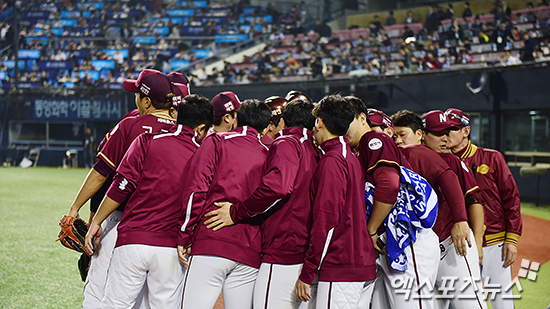 [엑스포츠뉴스 박지영 기자] 17일 오후 서울 송파구 잠실야구장에서 열린 '2016 타이어뱅크 KBO리그 포스트시즌' 넥센 히어로즈와 LG 트윈스의 준플레이오프 4차전 경기, 3회말 이닝 종료 후 넥센 선수들이 모여 서로 격려하고 있다.