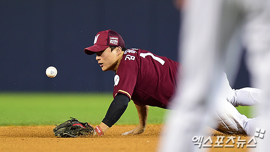 [엑스포츠뉴스 박지영 기자] 17일 오후 서울 송파구 잠실야구장에서 열린 '2016 타이어뱅크 KBO리그 포스트시즌' 넥센 히어로즈와 LG 트윈스의 준플레이오프 4차전 경기, 6회말 무사 1루 넥센 김하성이 LG 이천웅의 타구를 잡아내지 못하고 있다.