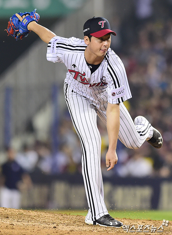 [엑스포츠뉴스 박지영 기자] 17일 오후 서울 송파구 잠실야구장에서 열린 '2016 타이어뱅크 KBO리그 포스트시즌' 넥센 히어로즈와 LG 트윈스의 준플레이오프 4차전 경기, 7회말 2사 1루 LG 진해수가 역투하고 있다.