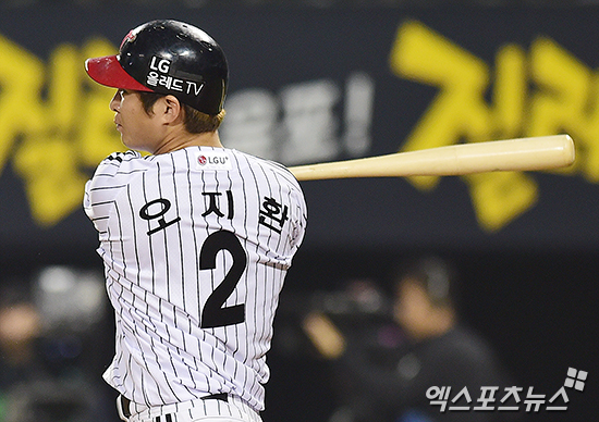 [엑스포츠뉴스 박지영 기자] 17일 오후 서울 송파구 잠실야구장에서 열린 '2016 타이어뱅크 KBO리그 포스트시즌' 넥센 히어로즈와 LG 트윈스의 준플레이오프 4차전 경기, 8회말 2사 1,2루 LG 오지환이 적시타를 치고 있다.