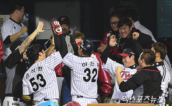 [엑스포츠뉴스 박지영 기자] 17일 오후 서울 송파구 잠실야구장에서 열린 '2016 타이어뱅크 KBO리그 포스트시즌' 넥센 히어로즈와 LG 트윈스의 준플레이오프 4차전 경기, 8회말 2사 1,2루 LG 이천웅이 오지환의 적시타에 득점한 뒤 더그아웃에서 동료들과 환호하고 있다.