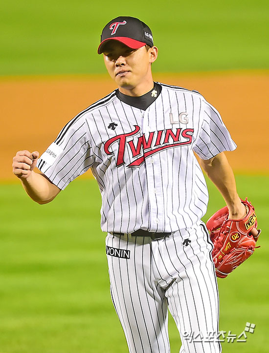 이날 경기에서 승리한 LG 임정우가 기뻐하고 있다.