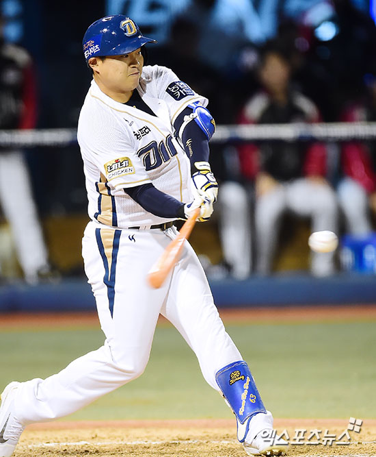 [엑스포츠뉴스 창원, 김한준 기자] 21일 오후 경남 창원 마산야구장에서 열린 '2016 타이어뱅크 KBO리그 포스트시즌' LG 트윈스와 NC 다이노스의 플레이오프 1차전 경기, 9회말 무사 1루 NC 권희동이 좌전안타를 날리고 있다.