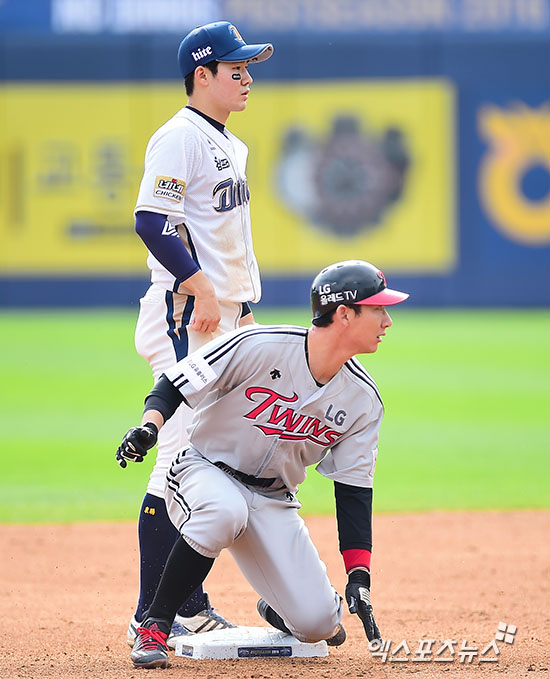 [엑스포츠뉴스 창원, 김한준 기자] 22일 오후 경남 창원 마산야구장에서 열린 '2016 타이어뱅크 KBO리그 포스트시즌' LG 트윈스와 NC 다이노스의 플레이오프 2차전 경기, 3회초 2사 1루 LG 손주인이 2루 도루에 성공하고 있다.