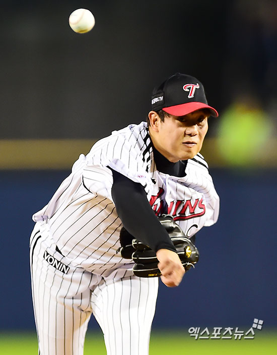 [엑스포츠뉴스 김한준 기자] 24일 오후 서울 송파구 잠실야구장에서 열린 '2016 타이어뱅크 KBO리그 포스트시즌' NC 다이노스와 LG 트윈스의 플레이오프 3차전 경기, 1회초 LG 선발투수 류제국이 역투하고 있다.