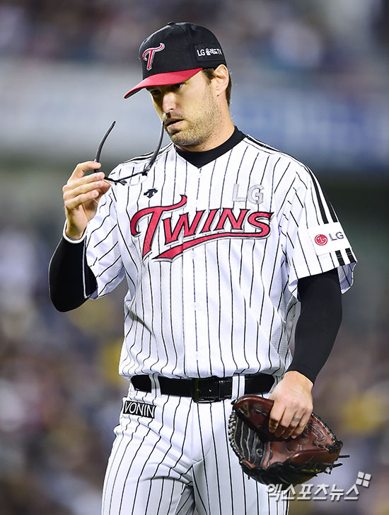 [엑스포츠뉴스 김한준 기자] 25일 오후 서울 송파구 잠실야구장에서 열린 '2016 타이어뱅크 KBO리그 포스트시즌' NC 다이노스와 LG 트윈스의 플레이오프 4차전 경기, 6회초 수비를 마친 LG 허프가 더그아웃으로 향하고 있다.