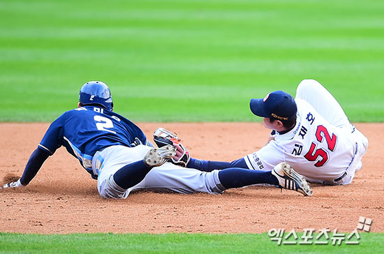 [엑스포츠뉴스 김한준 기자] 29일 오후 서울 송파구 잠실야구장에서 열린 '2016 타이어뱅크 KBO리그 포스트시즌' NC 다이노스와 두산 베어스의 한국시리즈 1차전 경기, 9회초 무사 NC 박민우가 우중간 안타를 날리고 2루까지 진루하다 두산 김재호에게 태그아웃을 당하고 있다.