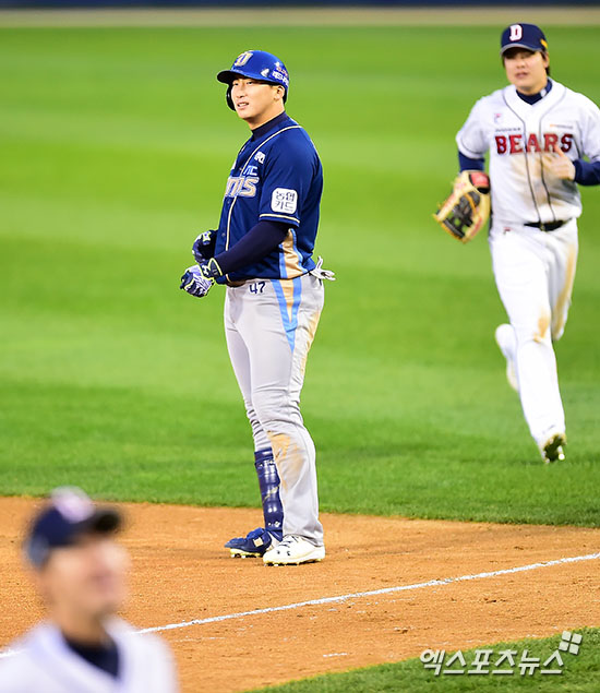 [엑스포츠뉴스 김한준 기자] 29일 오후 서울 송파구 잠실야구장에서 열린 '2016 타이어뱅크 KBO리그 포스트시즌' NC 다이노스와 두산 베어스의 한국시리즈 1차전 경기, 11회초 1사 1,2루 NC 나성범이 병살타로 아웃된 후 아쉬워하고 있다.