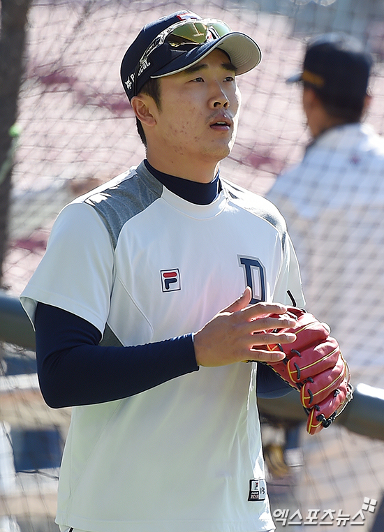 [엑스포츠뉴스 박지영 기자] 30일 오후 서울 송파구 잠실야구장에서 열린 '2016 타이어뱅크 KBO리그 포스트시즌' NC 다이노스와 두산 베어스의 한국시리즈 2차전 경기에 앞서 두산 허경민이 그라운드로 훈련을 나서고 있다.