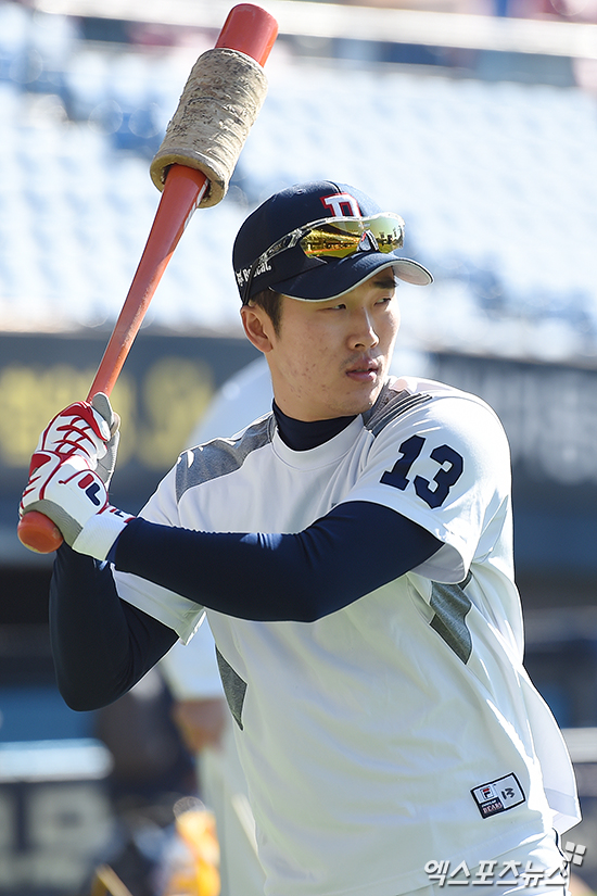 [엑스포츠뉴스 박지영 기자] 30일 오후 서울 송파구 잠실야구장에서 열린 '2016 타이어뱅크 KBO리그 포스트시즌' NC 다이노스와 두산 베어스의 한국시리즈 2차전 경기에 앞서 두산 허경민이 타격 훈련에 나서고 있다.