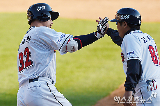 [엑스포츠뉴스 박지영 기자] 30일 오후 서울 송파구 잠실야구장에서 열린 '2016 타이어뱅크 KBO리그 포스트시즌' NC 다이노스와 두산 베어스의 한국시리즈 2차전 경기, 8회말 2사 두산 김재환이 솔로 홈런을 때려낸 뒤 베이스를 돌고 있다.