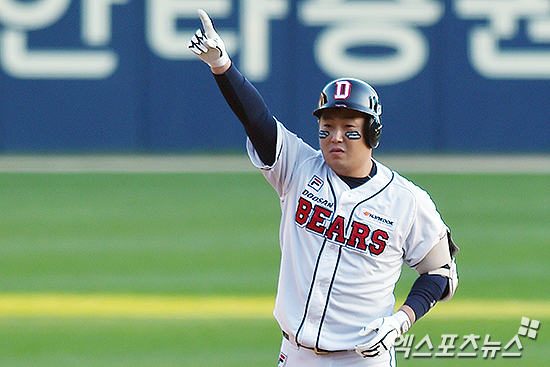 [엑스포츠뉴스 박지영 기자] 30일 오후 서울 송파구 잠실야구장에서 열린 '2016 타이어뱅크 KBO리그 포스트시즌' NC 다이노스와 두산 베어스의 한국시리즈 2차전 경기, 8회말 2사 2루 두산 양의지가 적시 2루타를 친 뒤 2루에서 환호하고 있다.