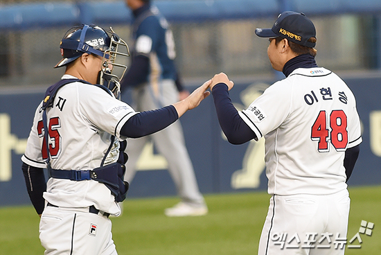 이날 경기에서 승리한 두산 양의지와 이현승이 하이파이브를 하고 있다.