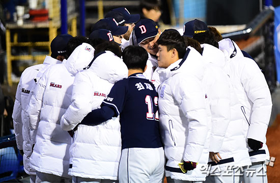 [엑스포츠뉴스 창원, 김한준 기자] 2일 오후 경남 창원 마산야구장에서 열린 '2016 타이어뱅크 KBO리그 포스트시즌' 두산 베어스와 NC 다이노스의 한국시리즈 4차전 경기, 경기 전 두산 선수들이 미팅을 가지고 있다.